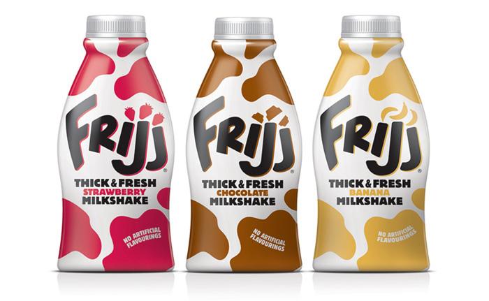 Have one look at these Frijj Milkshakes shrink sleeves labels: graphic cues in the typography, including strawberries, bananas and chocolate chunks, highlight the natural flavour variants and build the brand's quirky personality.