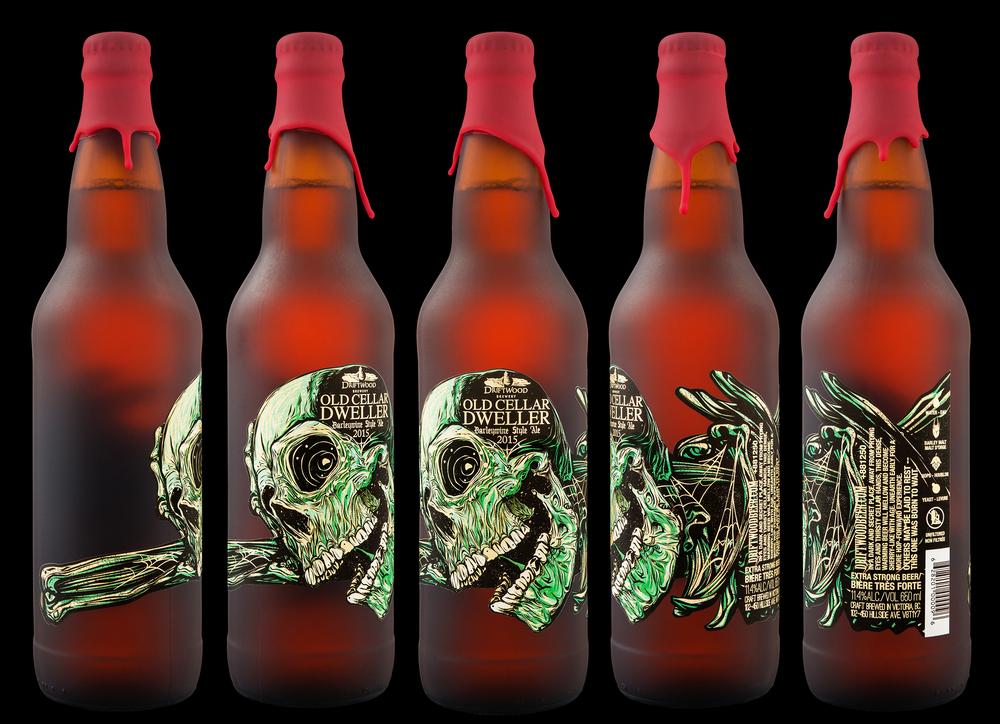 “For Driftwood Brewery’s Old Cellar Dweller barleywine, our task was to design a pressure sensitive label that showcases the strong character of the beer, while speaking to its aging potential. To these ends, we chose to illustrate our take on a grinning skull, favoring a bold, graphic approach. The dieline protrudes with ribs, teeth, and the long outjutting arm bones that create an excess of negative space, at once playful and decadent. Wax dip and gold foil lend the final touches and the spark of life to our skeleton in wait.”